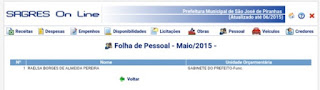 Abaixo a consulta junto ao sistema Sagres do TCE-PB que comprova que Raelza Borges realmente está lotada no gabinete do prefeito de São José de Piranhas.